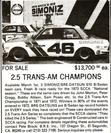 According to my research, in this time period, BRE built a total of 5 Datsun 510's; three BRE team cars to contest the Trans AM series; one customer car known as the "Jamaican" car, the offroad "Sugar Daddy" car to compete in the Mexican 1000 (driven by Morton and Brock), and "Pete Brocks Street Datsun 510" or the "Brock Buster".