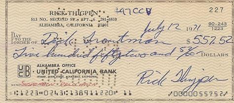 Troutman and Barnes were legendary race car fabricators based in Los Angeles and were the designers and builders of the iconic Reventlow Scarabs, Troutman and Barnes Specials and the first of Jim Hall's Chaparrals. Later, in 1967, Troutman and Barnes and BRE built the Hino Samurai. According to Thigpen Dick Troutman himself modified the Brock Buster's front A Arms and rear subframe. Thigpen has retained a cleared check to Dick Troutman for $557.52 with the memo "suspension relocation".