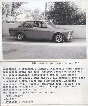 Rick Thigpen, who grew up in the Southern California car scene, wanted to build a street legal Trans Am 510 in the image of the BRE 510's that were dominating the Trans Am 2.5 series across North America. Logically he looked to Peter Brock and BRE (in nearby El Segundo, CA) for the parts and advice.